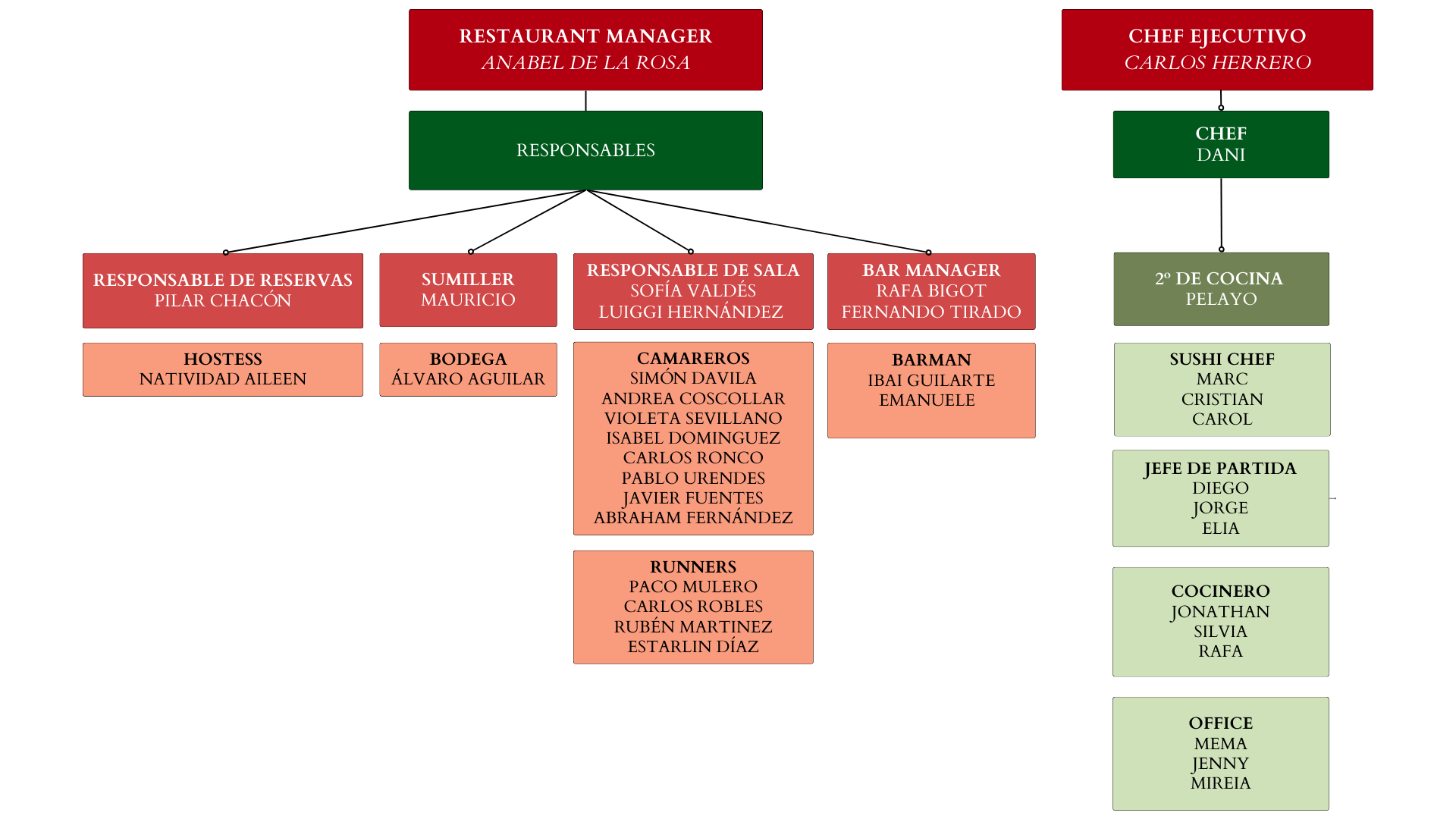 Aquí podréis visualizar la cadena de mando y cómo cada posición se interconecta dentro del restaurante, proporcionando una perspectiva global de nuestro entorno laboral. Este conocimiento es fundamental para fomentar la comunicación efectiva, el respeto mutuo y la colaboración entre todos los miembros del equipo.